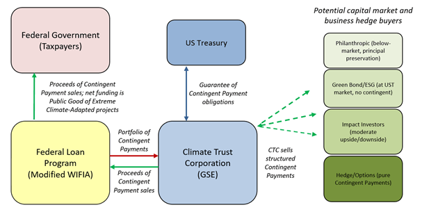 Likewise, a climate contingent loan portfolio can be sold through a separate federally owned GSE – call it the Climate Trust Corporation (CTC) — that will develop marketable securities from the portfolio.